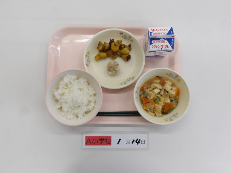 ごはん/牛乳/豆腐の中華煮/シューマイ/大学いも