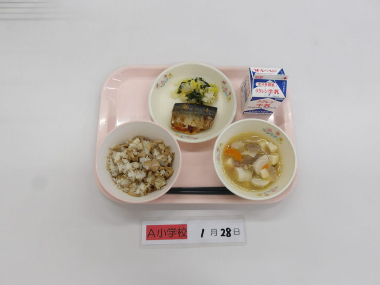 鶏飯/牛乳/のっぺい汁/さばのみそ煮/白菜のごま酢和え