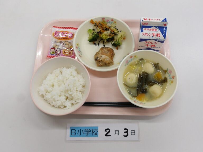 ごはん/牛乳/かながしらのみそ汁/鶏肉の梅マヨ焼き/野菜のひじき和え/節分豆