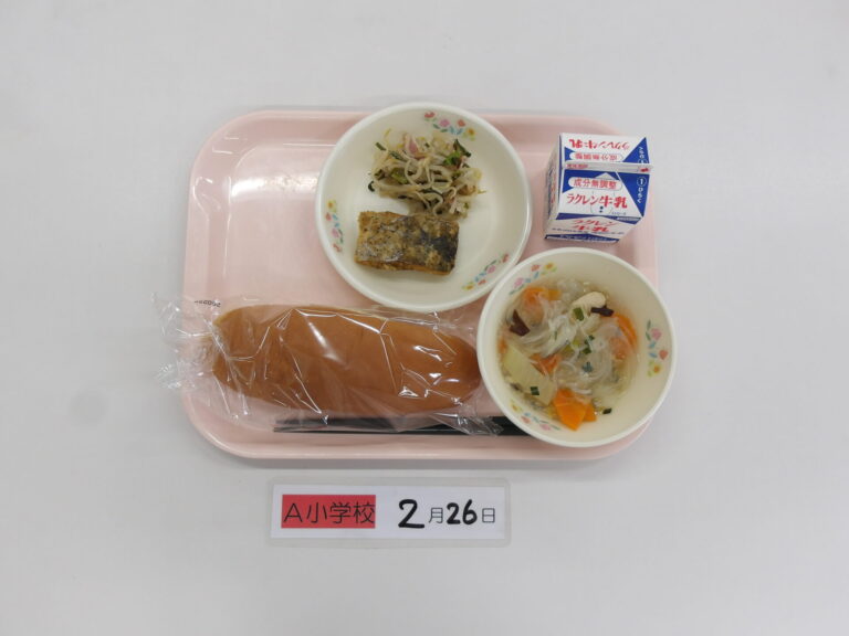 コッペパン/牛乳/春雨スープ/さわらのハーブ揚げ/にらともやしの炒め物
