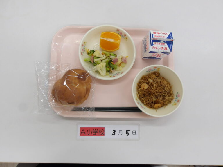 はちみつパン/牛乳/えび皿うどん/花野菜のソテー/しらぬい
