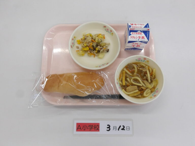米粉パン/牛乳/カレーうどん/鶏肉と野菜の炒め物