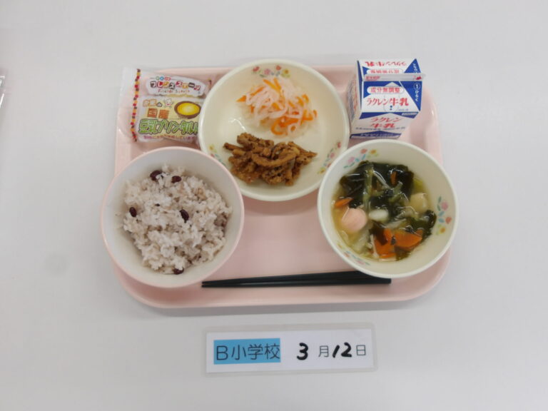 赤飯/牛乳/すまし汁/いかのかりん揚げ/紅白なます/お祝いデザート