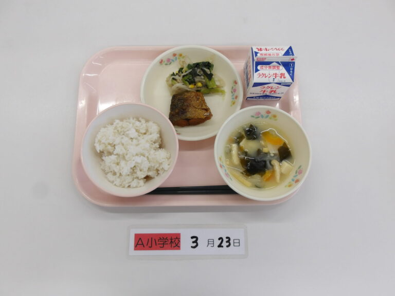 麦ごはん/牛乳/具だくさんのみそ汁/さばのソース煮/小松菜の炒め物