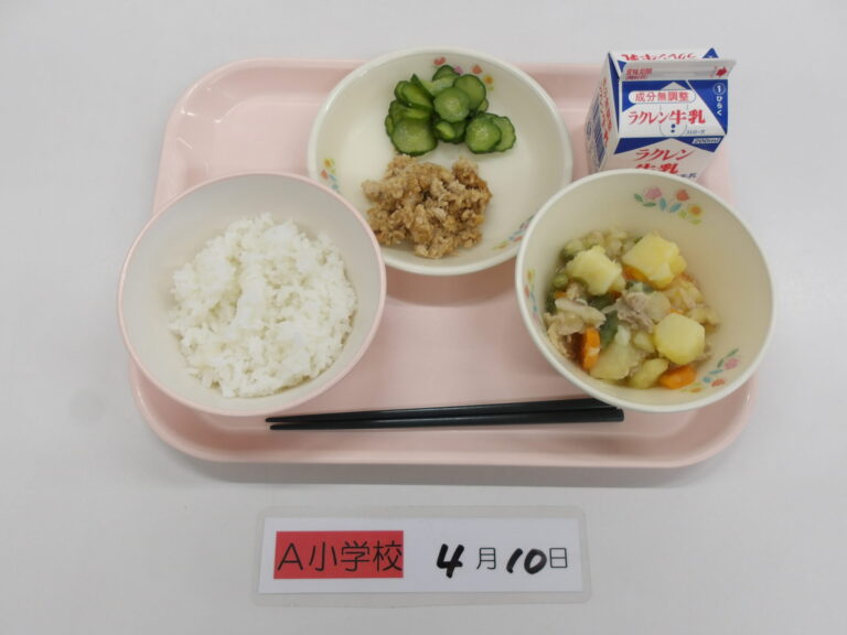 ごはん/牛乳/塩こうじ肉じゃが/納豆煮/きゅうりの塩もみ
