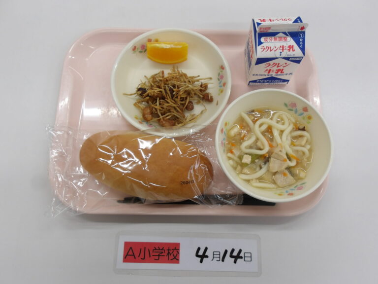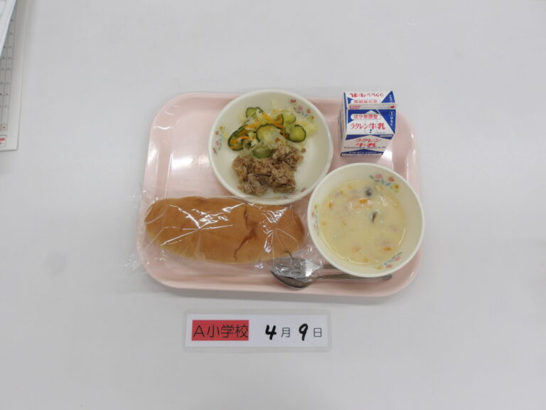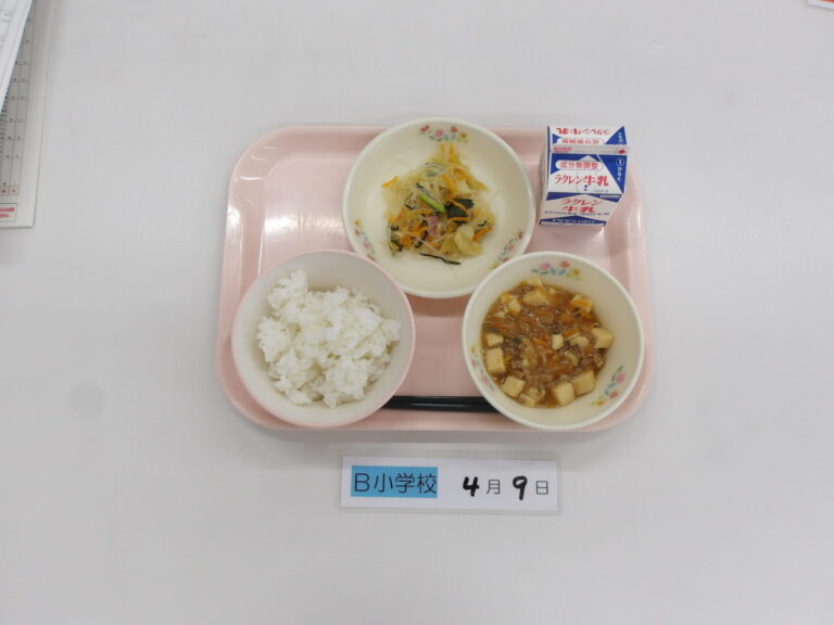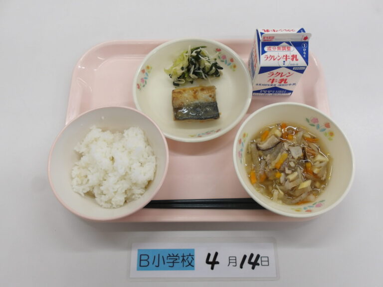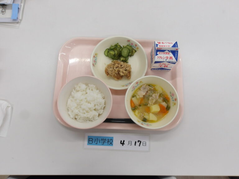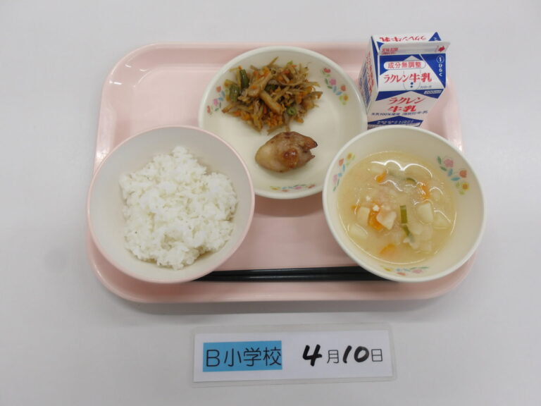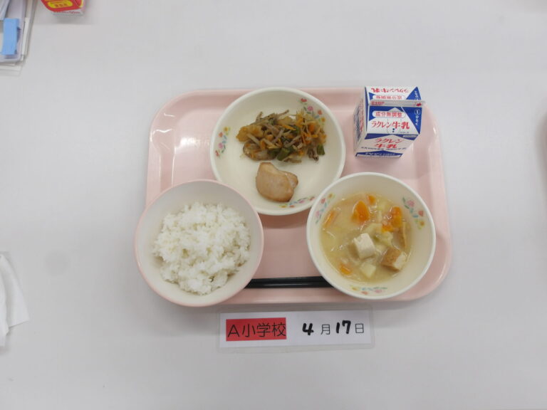 ごはん/牛乳/具だくさんのみそ汁/鶏の照り焼き/浦上そぼろ