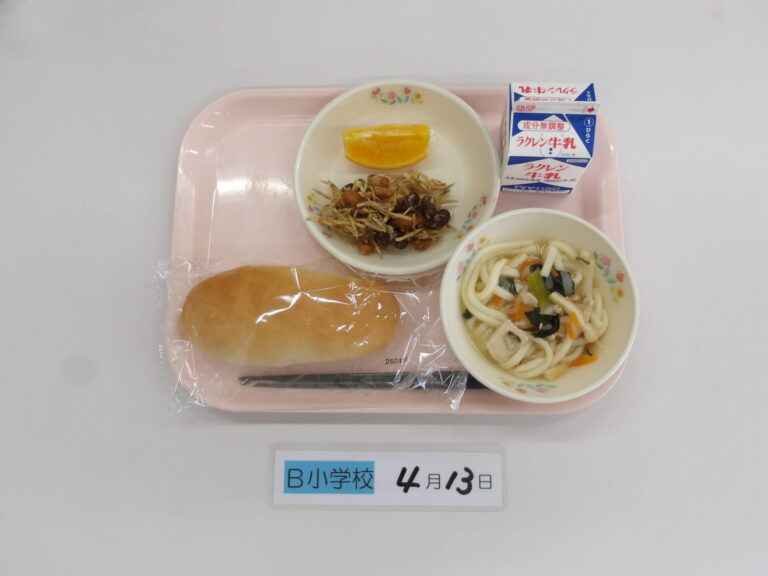米粉パン/牛乳/五目うどん/ごぼうと三色豆の揚げ煮/オレンジ
