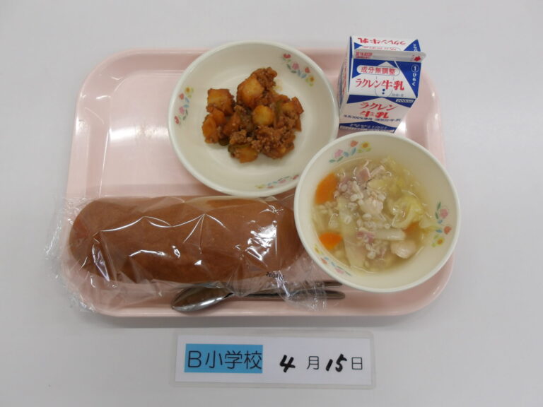 コッペパン/牛乳/麦入り野菜スープ/ポテトのミートソース