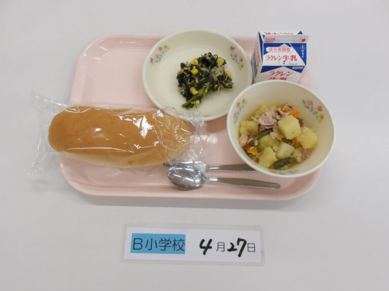 コッペパン/牛乳/じゃがいものベーコン煮/ツナとほうれん草のソテー