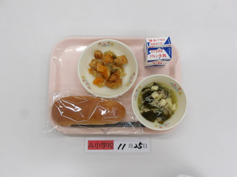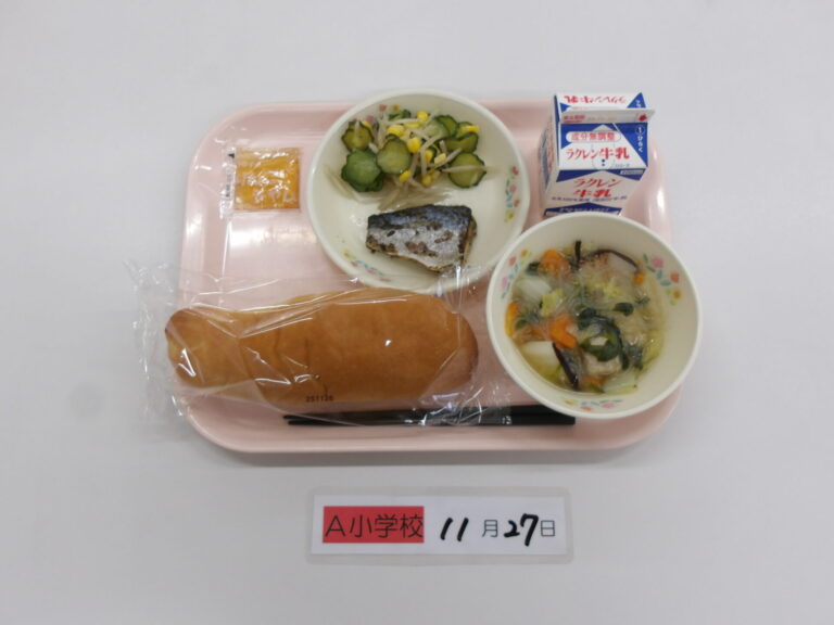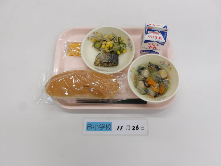 コッペパン/牛乳/白菜と肉団子のスープ/さばのハーブ焼き/ごぼうサラダ/りんごジャム