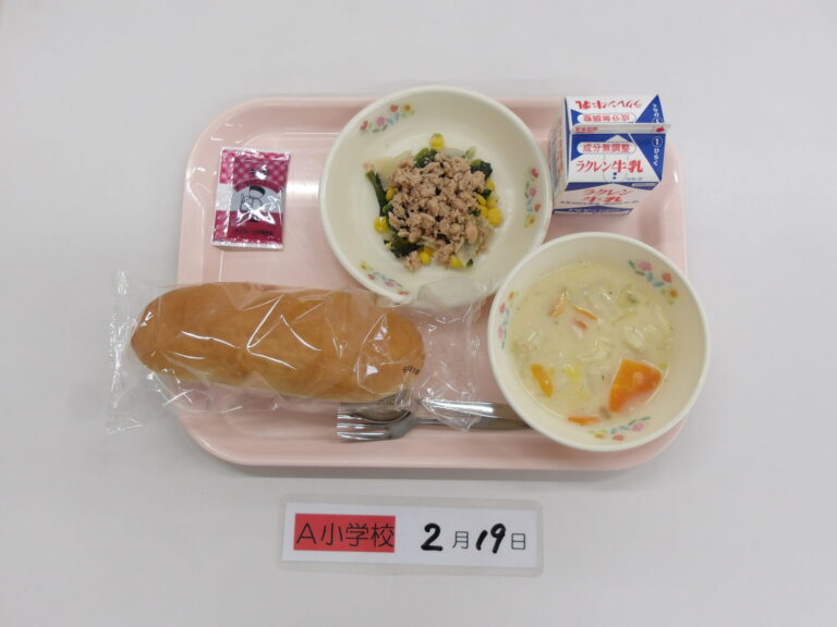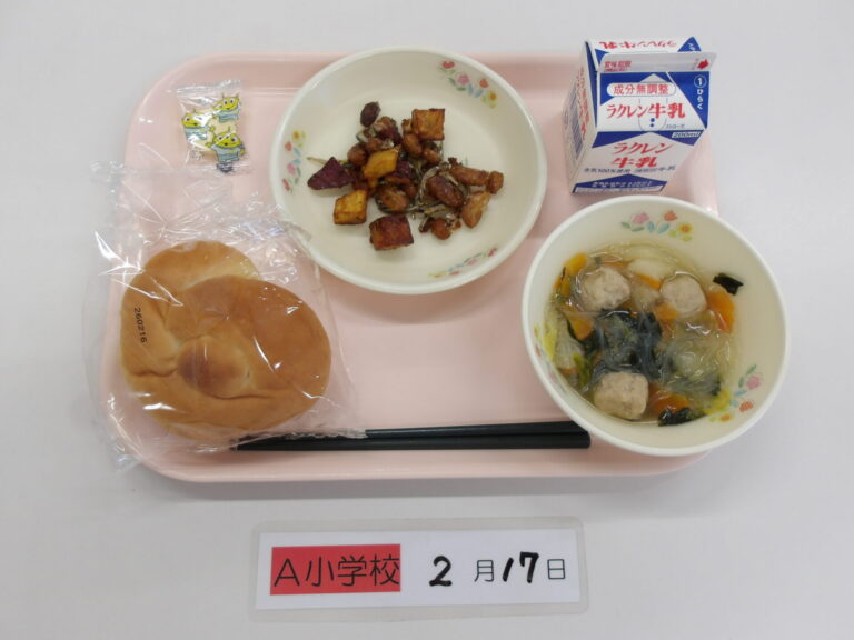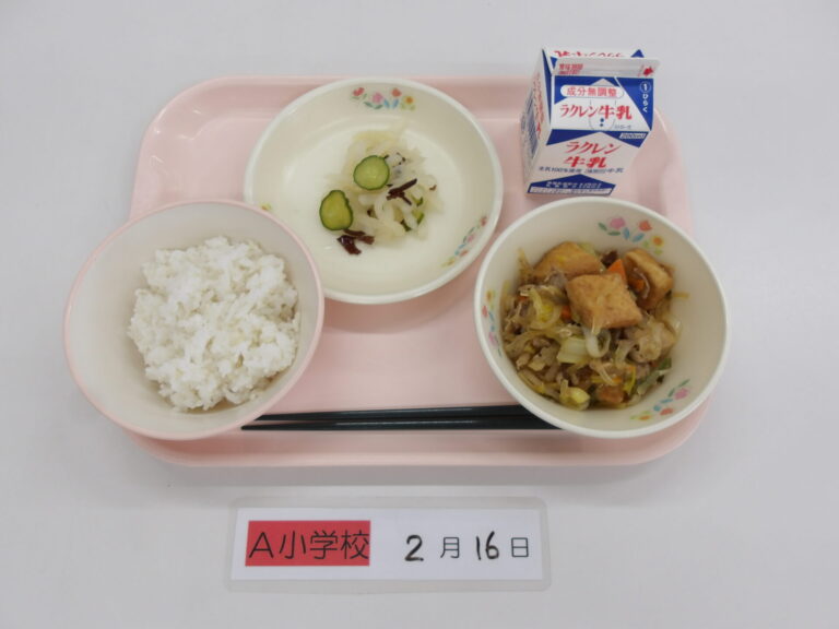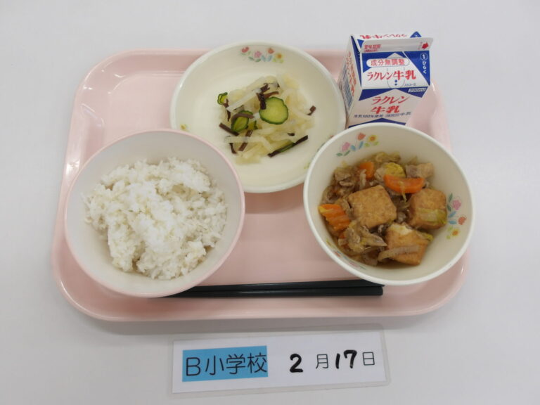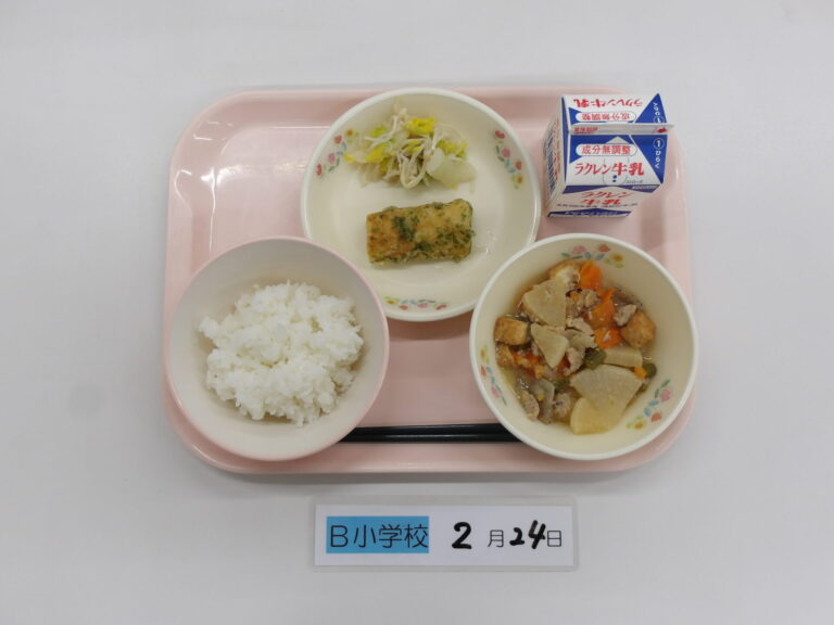 ごはん/牛乳/豚肉と大根のみそ煮/竹輪の磯辺揚げ/白菜とえのきの甘酢和え