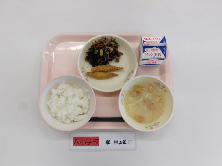 ごはん/牛乳/たまねぎとじゃがいものみそ汁/きびなごカリカリフライ/ひじきの甘辛煮